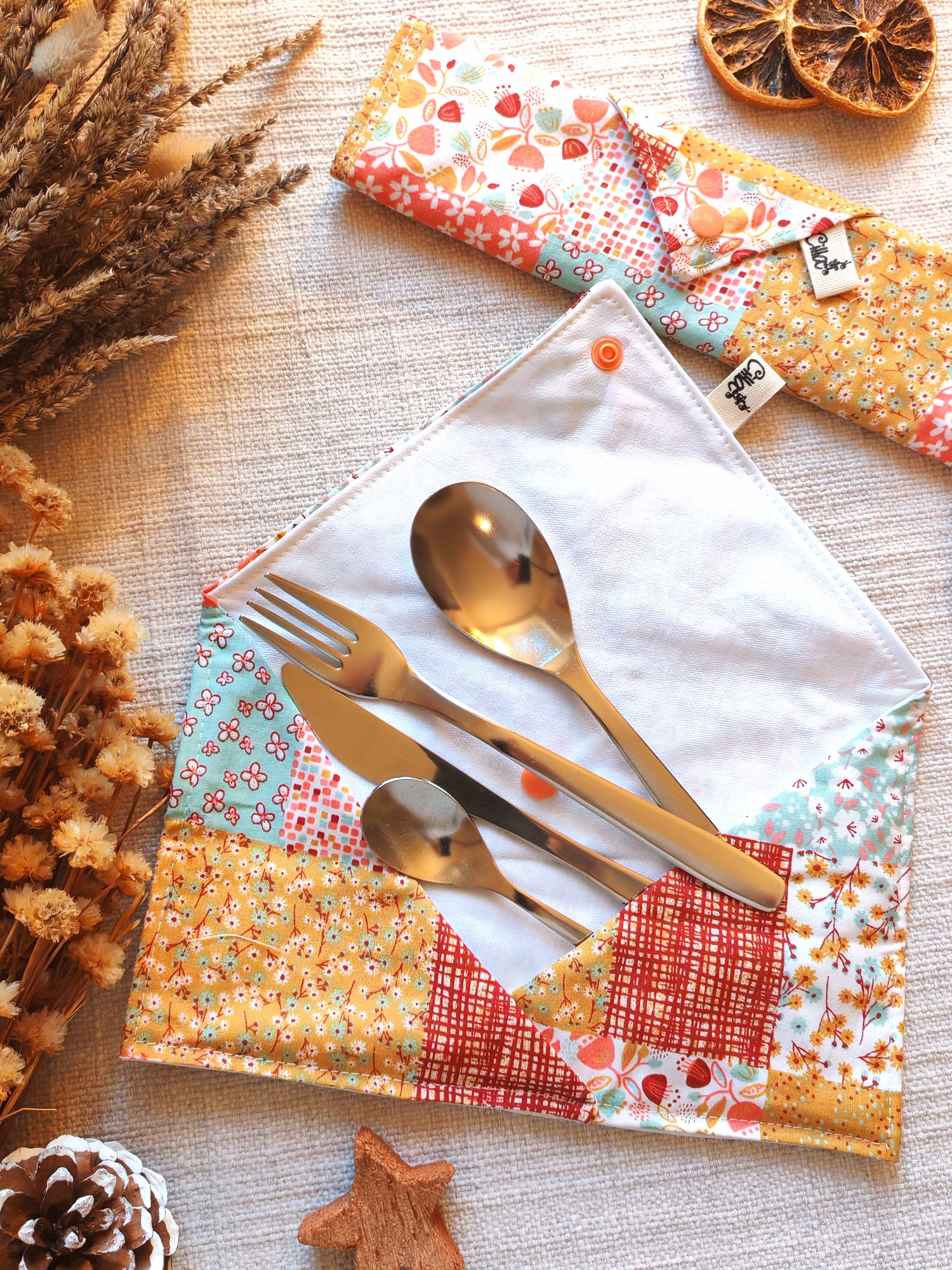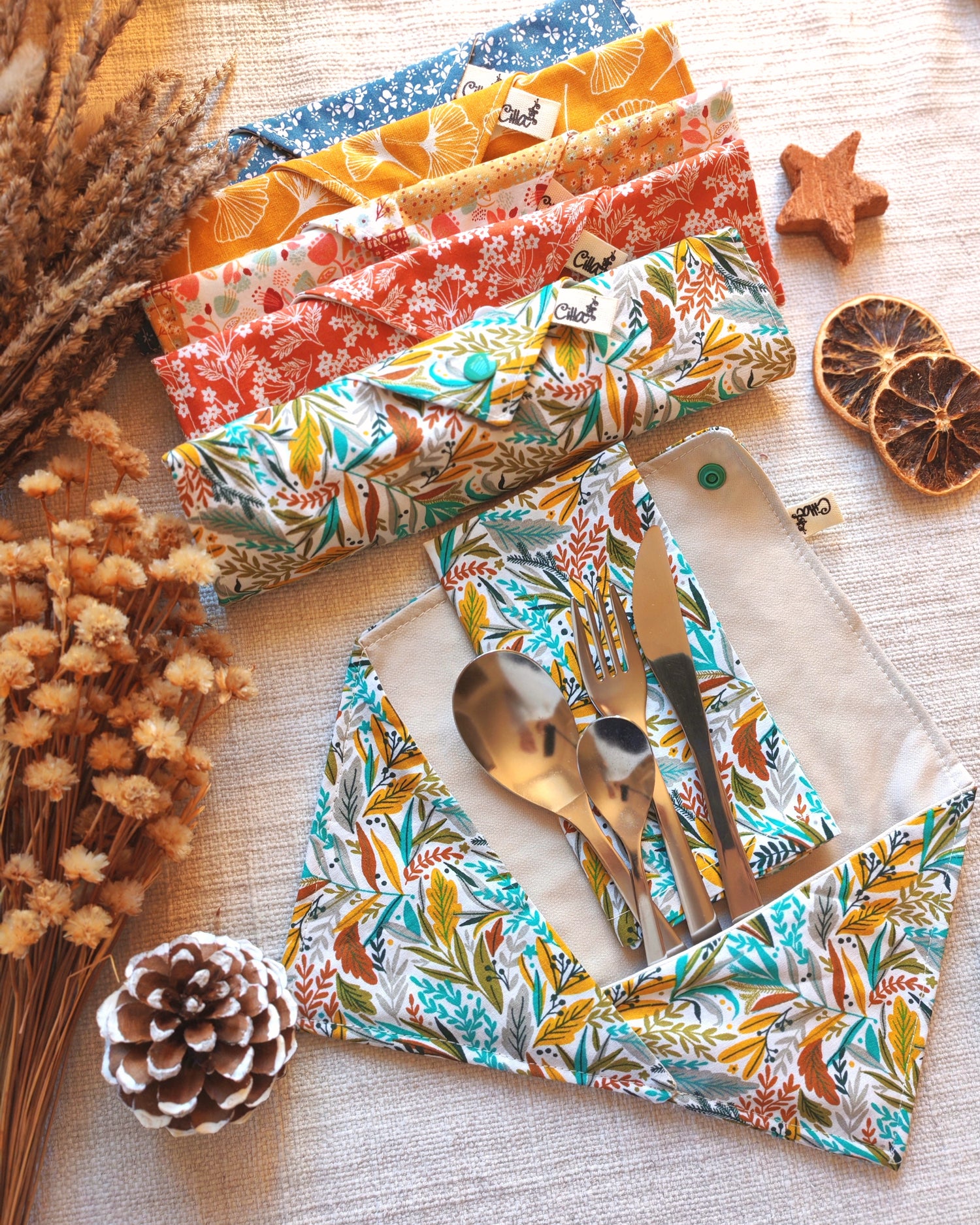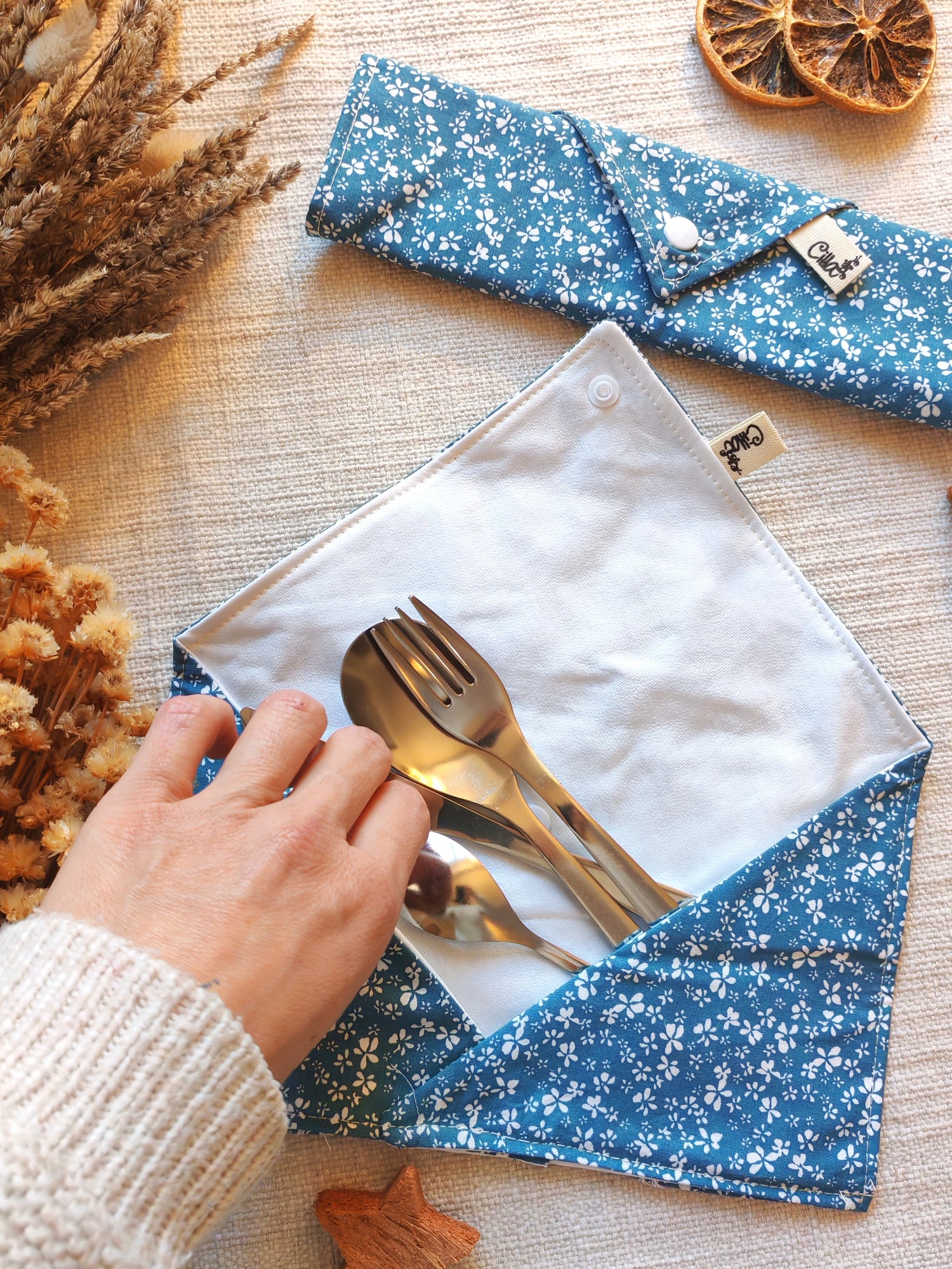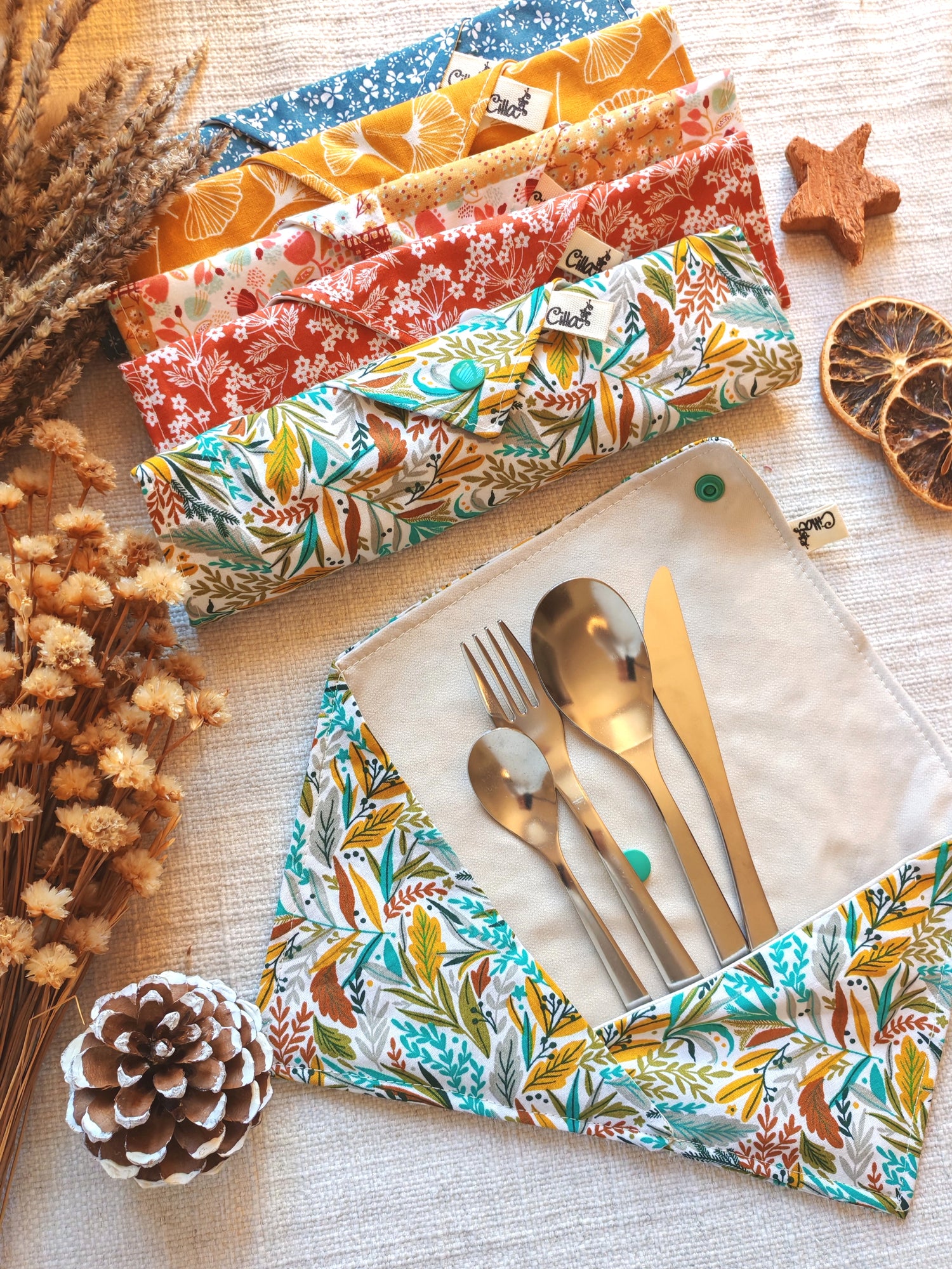Così è nato questo astuccio porta posate artigianale, cucito a mano in cotone certificato OEKO-TEX, con fodera interna impermeabile e traspirante in PUL: un materiale resistente, facilmente lavabile e perfetto per l’uso quotidiano.