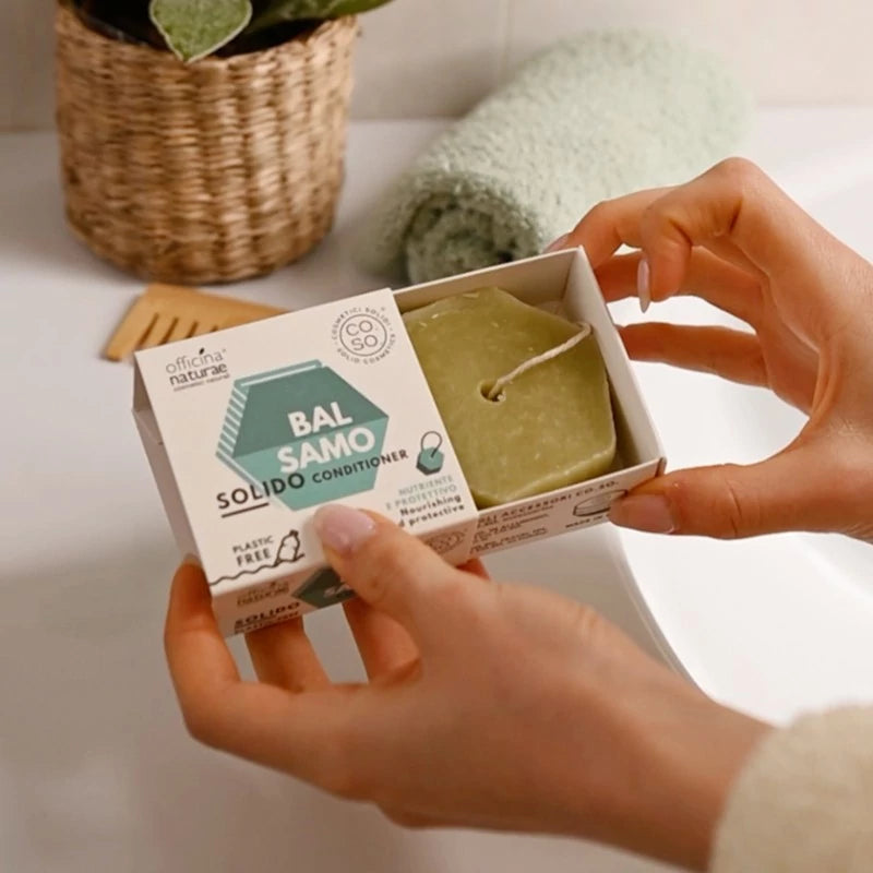 Il Balsamo Solido Nutriente e Protettivo è pensato per capelli normali o fini e delicati. Una formula innovativa, senza acqua e senza plastica, che nutre e protegge la chioma lasciandola morbida e lucente.