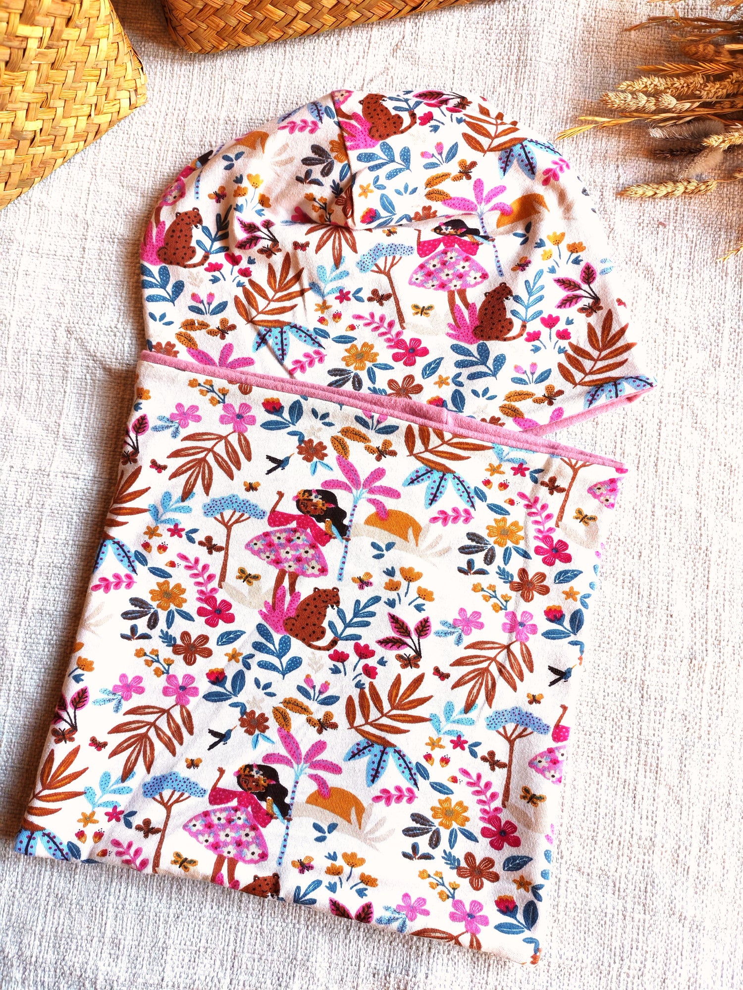 Il cappello e lo scaldacollo sono entrambi double face: posso essere idossati dal lato fantasia oppure a tinta unita per cambiare look ogni volta che si vuole! Il tessuto elasticizzato permette una vestibilità comoda e adattabile: grazie alla sua elasticità, accompagna la crescita ed è indicato indicativamente dai 3 anni fino ai 6 anni e oltre.