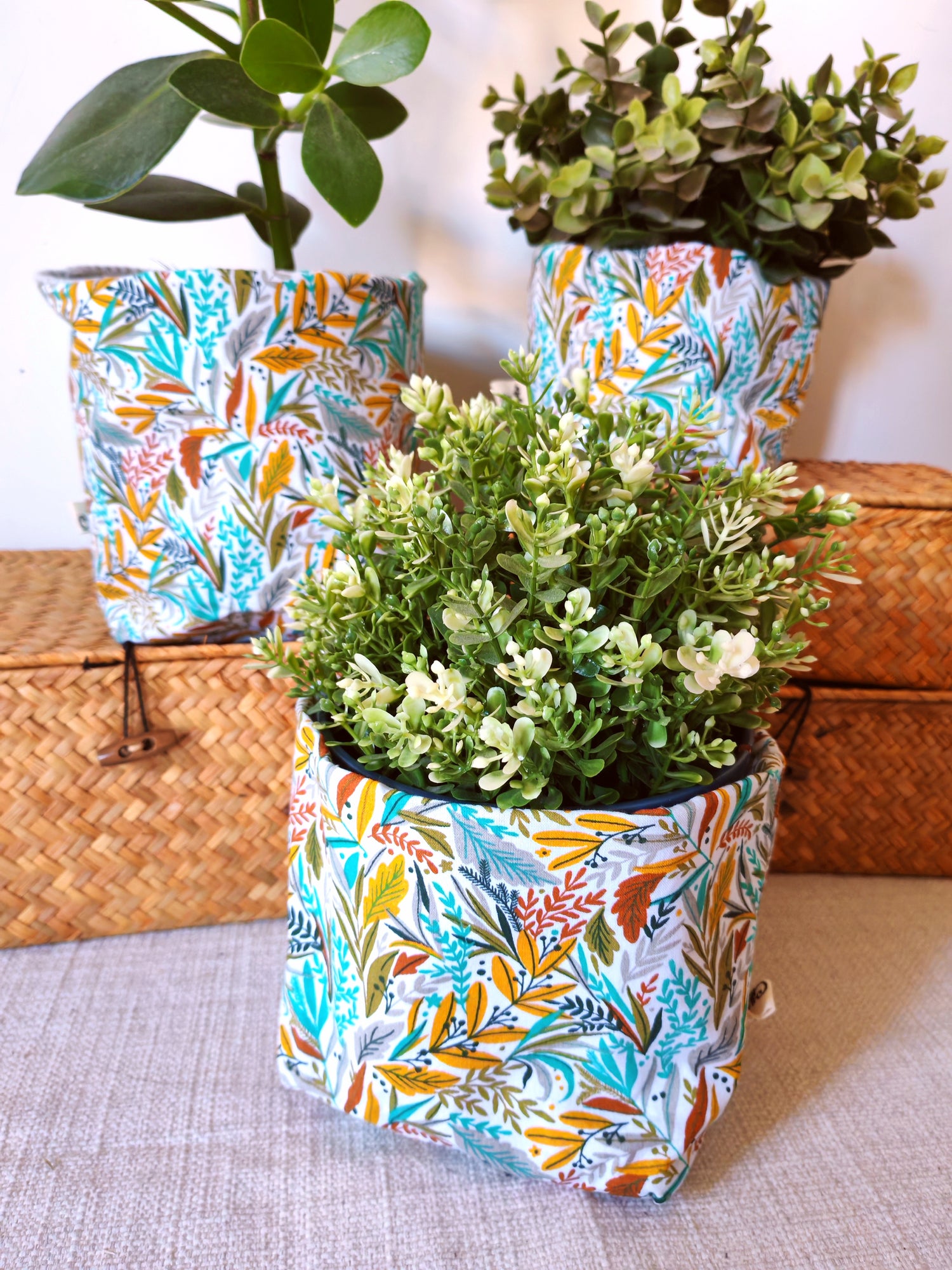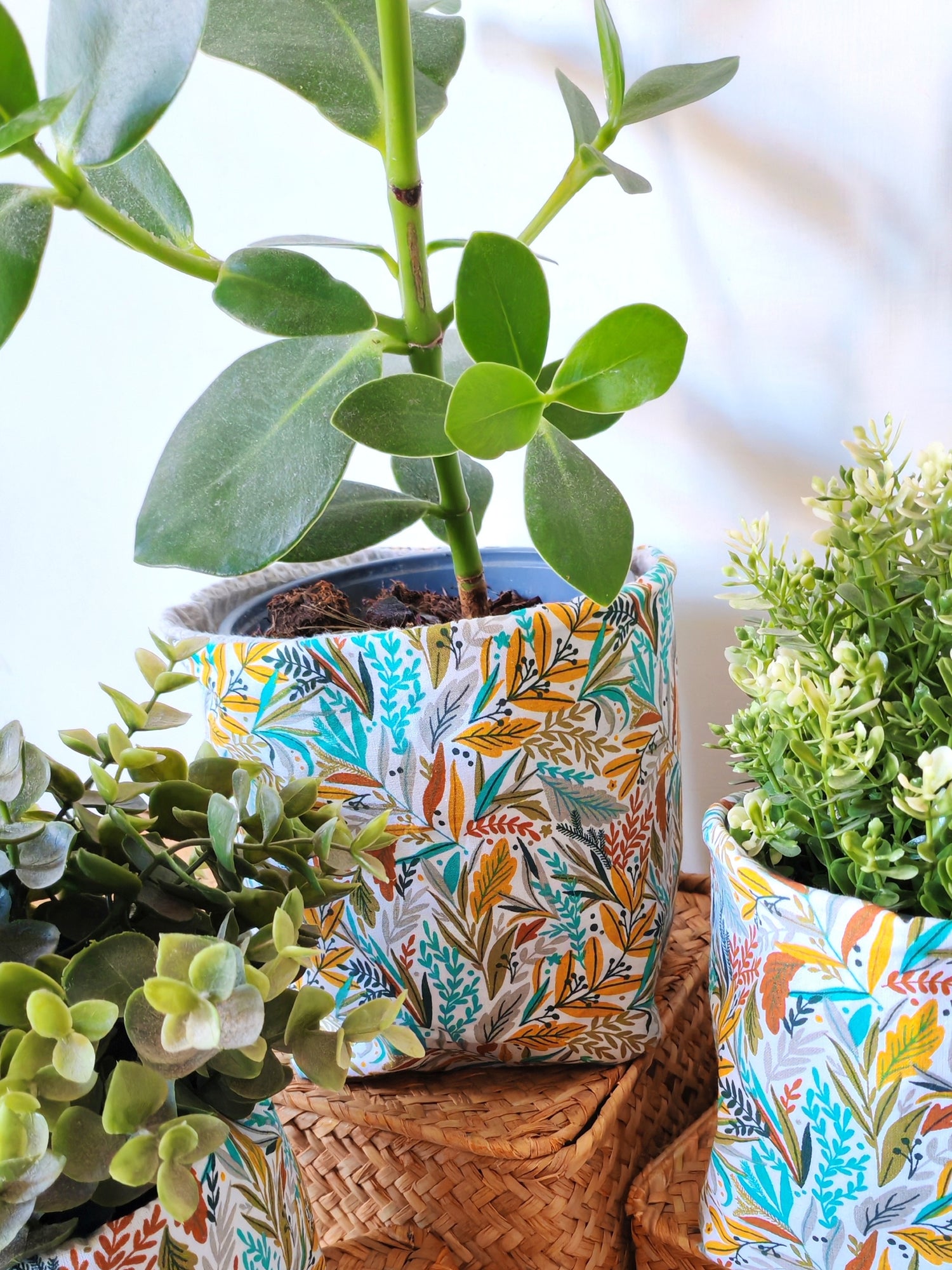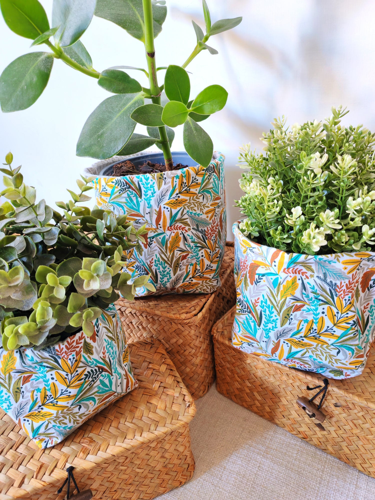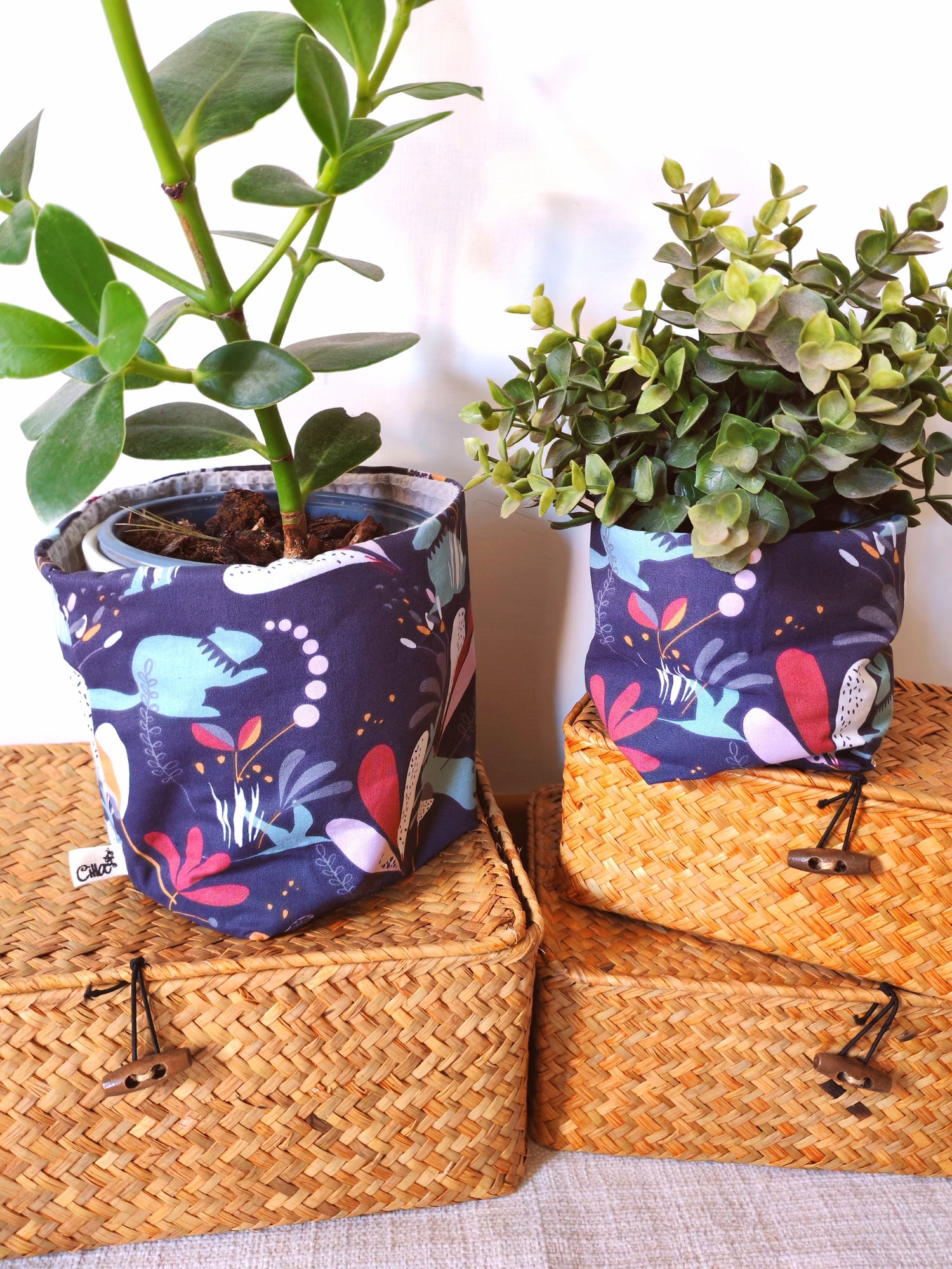 Realizzato a mano in cotone certificato Oeko-Tex, con fodera interna in spugna assorbente che aiuta a mantenere la forma e a proteggere le superfici da eventuali gocce d’acqua, è un coprivaso pratico, lavabile e rispettoso dell’ambiente.