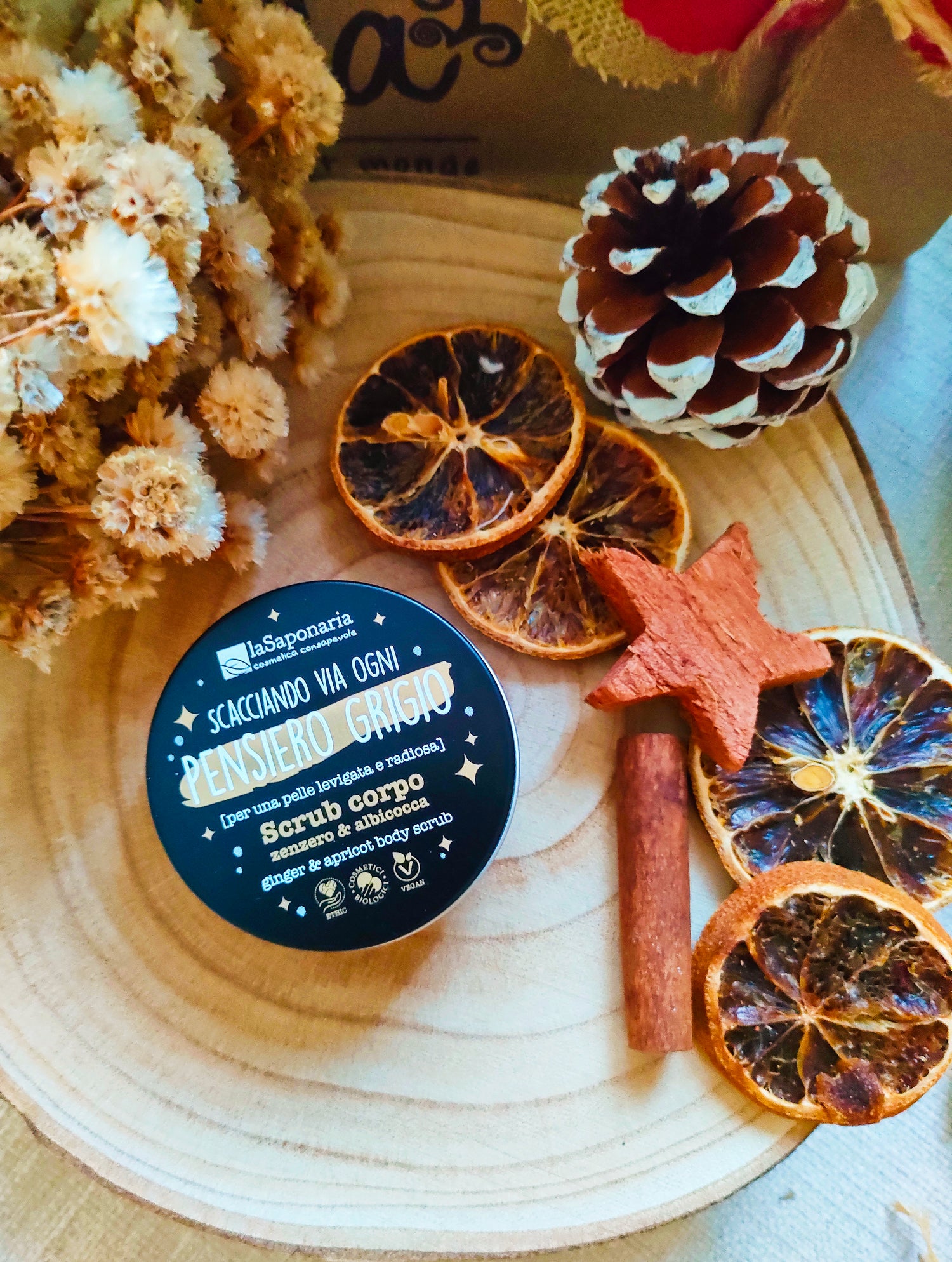 "Scacciando via ogni pensiero grigio": questo è il grazioso messaggio scritto sulla pratica e deliziosa scatola in alluminio dello Scrub Corpo Zenzero e Albicocca